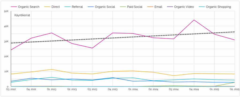 Järjestön Google-liikenne on kasvanut koko analytiikkaseurannan ajalta 2022-2025, eikä mitään laskua ole havaittavissa. Q1 2025:ssä järjestön sivustoon kohdistui noin 30 000 käyntikertaa hakukoneista.